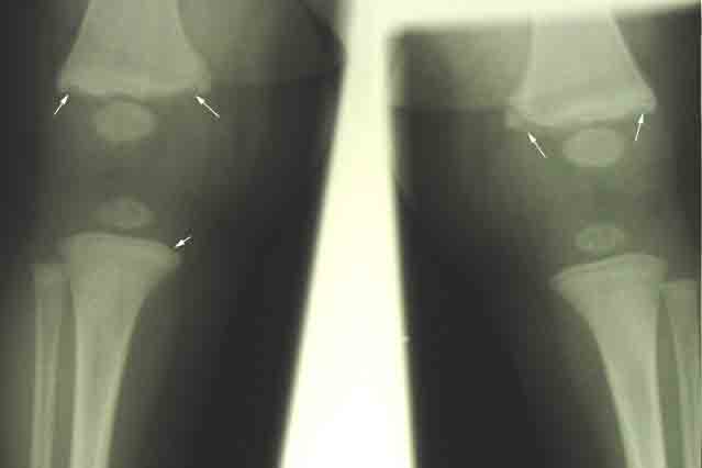 Classic metaphyseal lesions - bucket handle fractures and corner fractures (white arrows) in a 9-month-old child. (Photo courtesy of Childrens Hospital Boston Child Protection Team.)